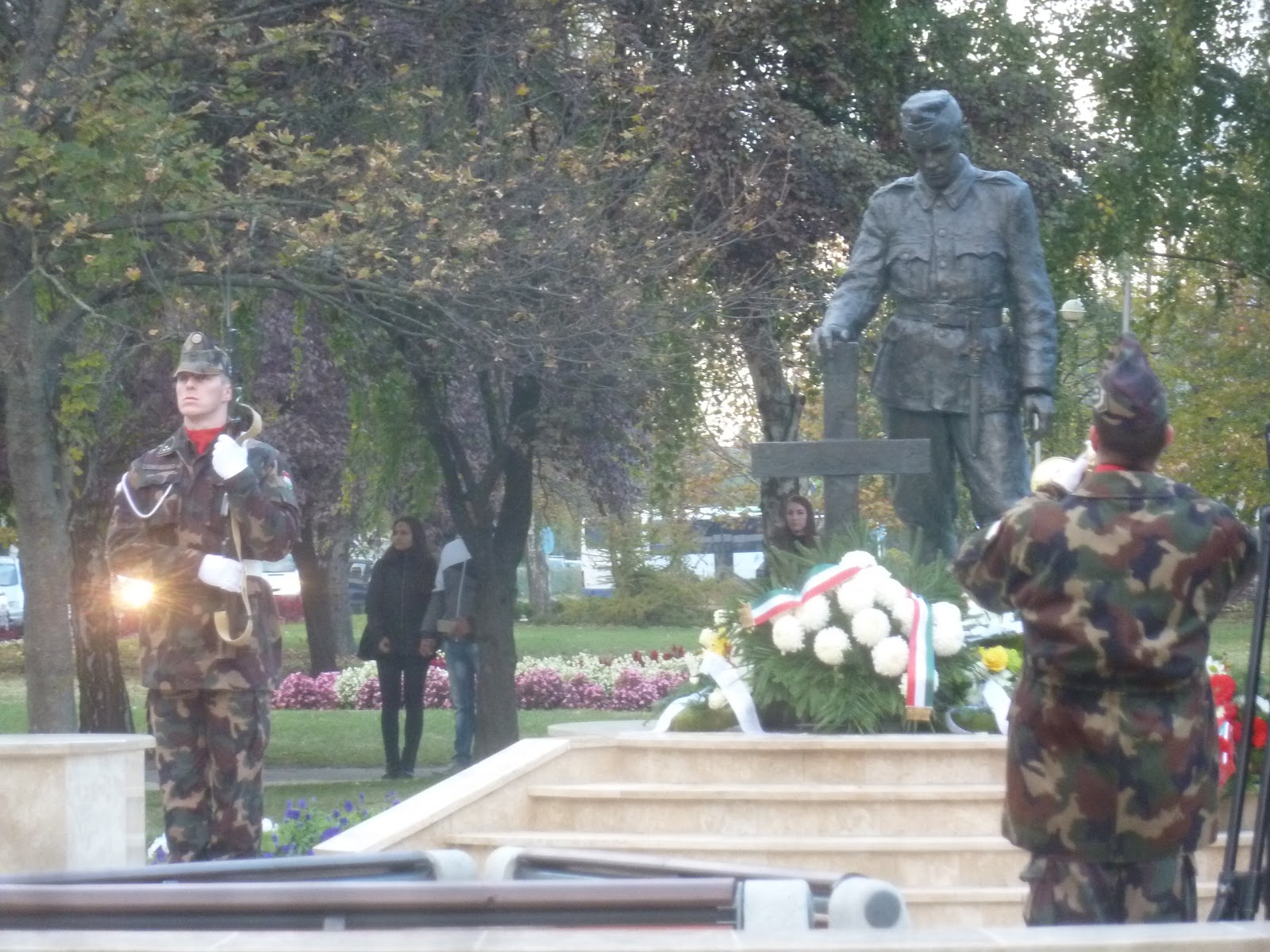 látom, közelebb menve , hogy a gimi előtti felújított téren, a keresztre dőlő katona szobra és az emlékműszalag körül állnak, a második világháborúban elesett hős katonákra emlékezve... a polgármesterasszony felolvassa az országgyűlési képviselőnk sorait is (ékes dupla nyelvbotlással a végén: fejtsünk hajat azaz szemrebbenés nélkül folytatja, mintha csak variációk lennének egy témára: hajtsunk fejet - előttük.