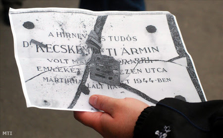 "Leverték és összetörték Makó egykori főrabbijának, Kecskeméti Ármin emléktábláját mút éjjel... Az emléktábla helyére festékszóróval feliratot fújtak...."