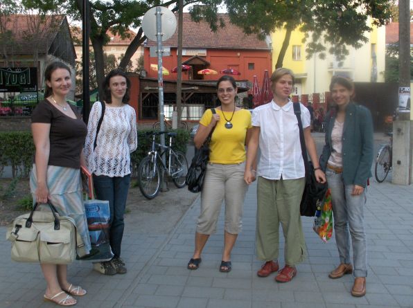 A főtéren, a Korona előtt szinte belebotlok biciklimmel egy piros buszba, amit diáksereg áll körül,- nicsak megint egy volttanítvány-irodalomtanárral élükön. Megérkezett Makóra is aNyugatbusz kiállítása! Be már nem férek a gyerkőcöktől, de egy kis asztalkán könyvjelzők, képeslapok, archív fotókkal, gyerekeké,("Irók Fiatalon -áll a fotók alján) akikből -k i hitte volna!, a képeken még nem látszik, vagy mégis? - a Nyugat szerzői lettek! Találós kérdésnek is jó. Megragad egy szomorú-riadt tekintetű kisfiú fotója, tiroli nadrágja zsebébe süllyesztett kezekkel - nem találom ki, bár megtehetném, hiszen a tragikum máris ott a szemében; ő Radnóti Miklós. És egy faragott szék támlájába kapaszkodó Kosztolányi: a "szegény kisgyermek"; a gyanútlanul mosolygó, mezitlábas baba: Szerb Antal, az elszánt, okos tekintetű, kicsit gyanakvó József Attila... azt se tudom, melyik képeslapot vigyem haza... délután a soron következő középiskola előadótermében a busz kísérője vetített állóképeken mutatja tovább a szerzőket, immár felnőttként (meg a szerkesztőket), s a bemutató végén, gratisként egy 15 perces összeállítást régi archiv filmen íróink életéből, akár a "privát Magyarország" néma filmei, zongorakísérettel, csakhogy itt híres íróinkat láthatjuk némafilszereplőként. Szívszorongató a zárófilm: Kosztolányi - vicces jelenetek után - családjával: feleségével, fiával) egy kerti lépcsőn jön lefelé, felénk, lassan, szaggatottan, néha mintha vissza is lépnének, leveszi, meglengeti kalapját, felénk, barátságosan integet, a kép egyre kisebb, távolodó, majd eltűnik... szívszorongatón.... Előadás után, vásárlás közben a pénztárnál nem találom a táskámban a pénztárcám, utoljára az írók képeslapjai vásárlásakor az asztalkára téve láttam a busznál, nosza odakarikázok, de nincs ott, hátha otthon, persze, lázas örömömben vissza se tettem eredetileg se a táskámba, hanem ott van a képeslap-zsákmányaim mellé dobva az asztalon... nosza vissza a kedves, aggódó buszkísérőket megnyugtatni, hogy megvan a pénztárca, s még van pár perc az 5-ös zárásig, most fel is megyek a buszba, Babits, Ady, Kosztolányi, Juhász Gyula, Tóth Árpád, Füst Milán, Kaffka Margit, Szép Ernő, József Attila, Déry Tibor, Illyés Gyula, Weöres Sándor közé, s a busz végében ismétlődve láthatom újra, még élesebben a filmösszeállítást, nem is mozdulok előle. Rabul ejt világuk. Karinthy Frigyes egy havas délután kisfiával , Cinivel, évődik, Móricz Zsigmond dolgozószobájában komolyan gépel, az első ünnepi könyvhéten, 1929-ben, dedikál, egy baráti asztaltársaságban ott vannak az asztal körül Szabó Lőrincék, Német Lászlóék, s ahogy gesztikulál, beszél , körülnézegetve, (nem tudni mit mond) de úgy egészében emlékeztet valakire, igen egy ma élő íróra, akivel összefutottunk a múltkor az Intercityn Pestről jövet, s épp ma este van a Grand Caféban: "FELOLVAS AZ ÍRÓ" Nahát , akkor bemegyek megnézni, meghallgatni! akarok már hallani is a néma képek és némafilm után egy igazi élő írót!