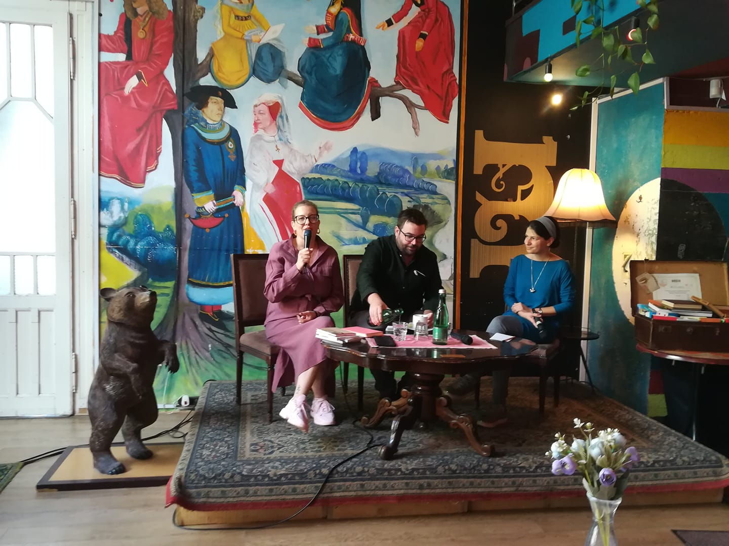 épp az irodalmi felolvasásokról, értelméről (vagy értelmetlenségéről?) olvas fel, a Grand Café mozihelyiségének filmvászna előtt iróniával, és öniróniával, csak hallgatom, mint mesét, készülő regényéből részleteket, a felolvasási sorozat tematikája jegyében cigányokról, zsidókról, de milyen - tanítani való, de megtanulhatatlan -egyszerre külső és belső (empatikus) látással! - (nem is lehet anélkül igazán író, az író!) - majd megint önirónia, az iró mint szakácskönyvi tétel, hogyan készitsük-fogyasszuk el, aztán paródiát (alias Karinthy Frigyes...)