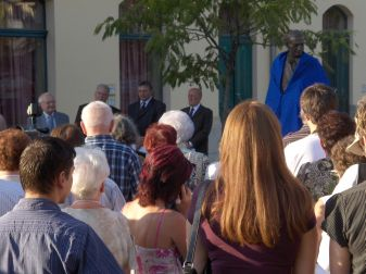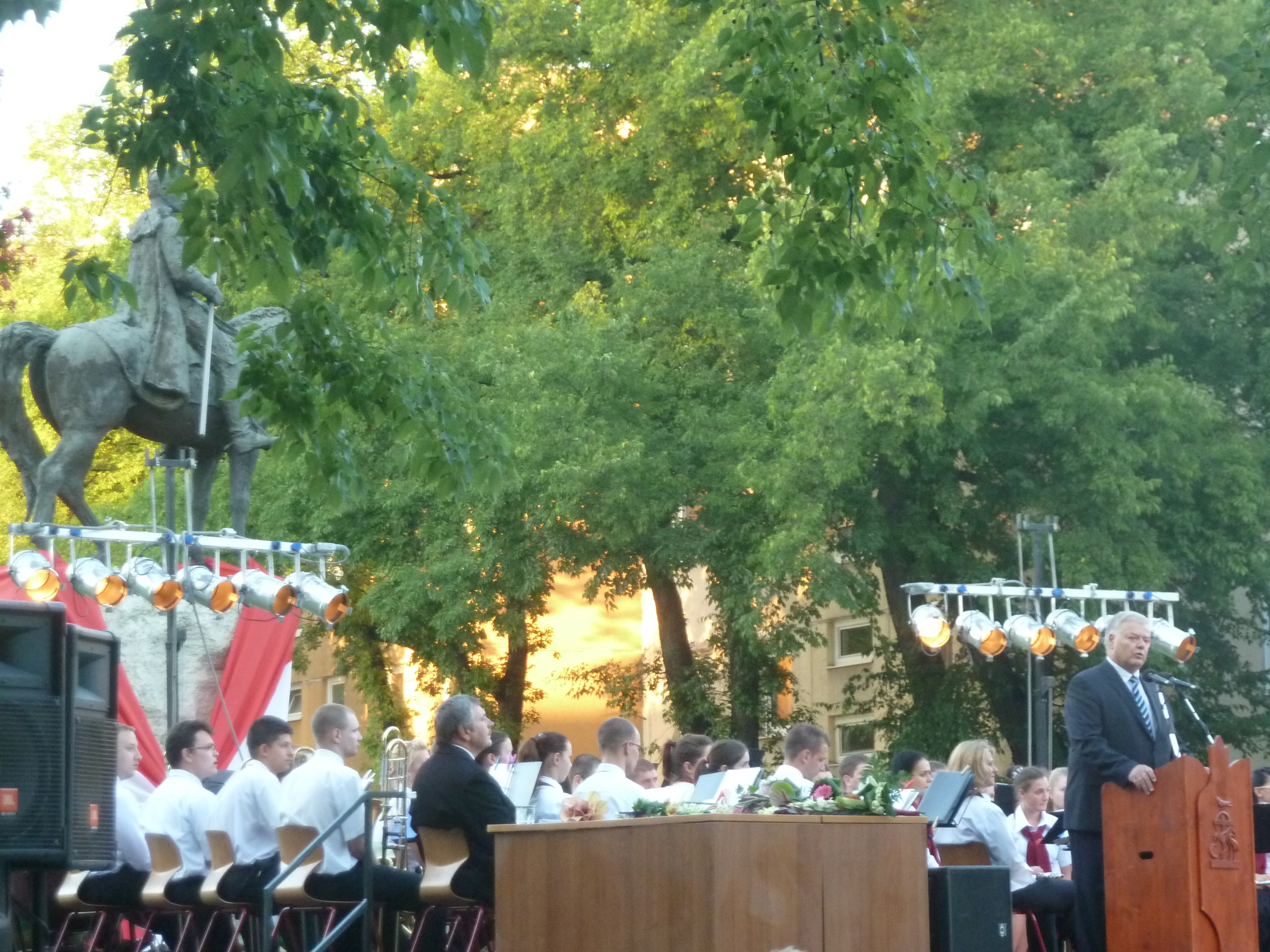 a felöltöztetett István szobor és az ünnepi fúvószenekar, felhővel takart teliholddal