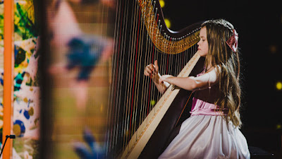 no meg a hárfás kislány, tényleg, akár egy angyal, egy komoly, remekül zenélő angyal (a kabala kutyájával, mert azért kislány is)