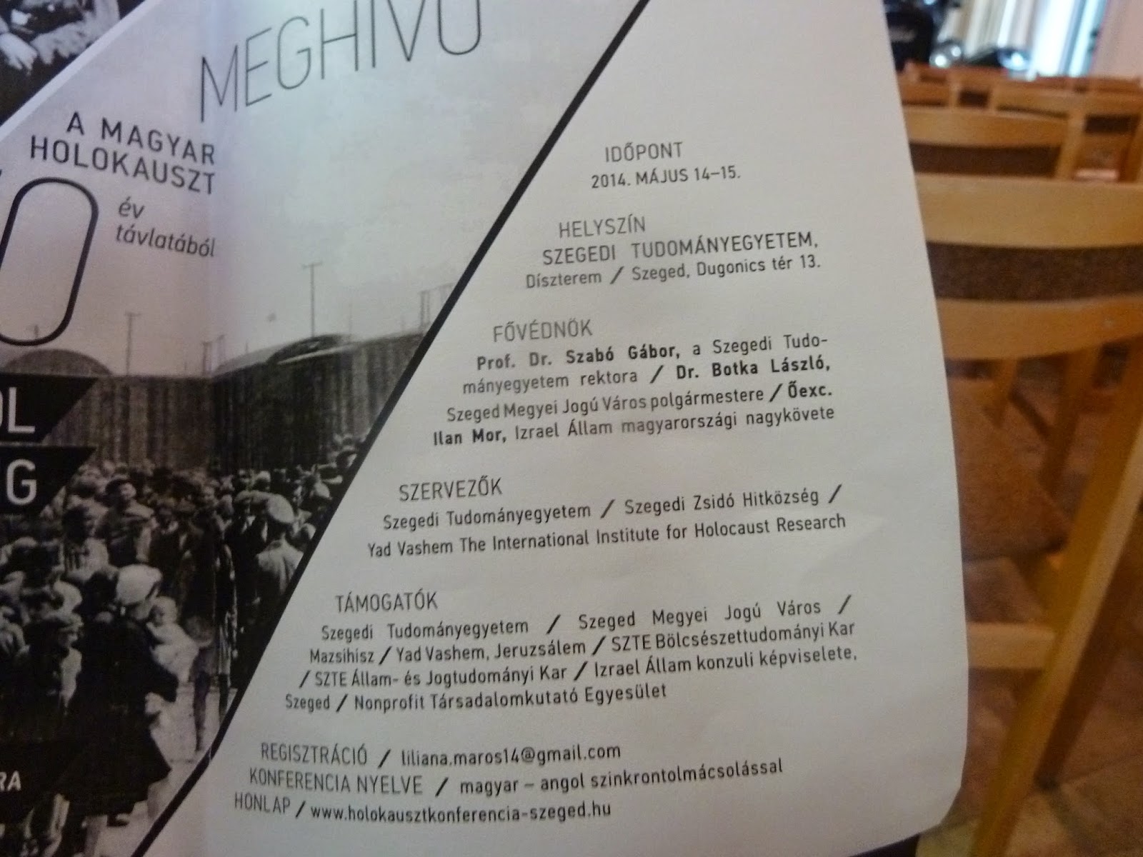 a digitális regisztrációra még előző nap rögtön választ kaptam, köszönettel, s kezdéskor már előkészítve mindent: kitűző névjegyem, dossziéban meghívó , prospektusok, könyv , többnyelvű, az előadások absztraktjaival, toll, jegyzetfüzet, (a szervező SZTE jelzéseivel) ,tiszteletjegy borítékban az esti klezmer koncertre a zsinagógába... és még Szegedről is egy-két könyvecske, programfüzet -a -gondolom - küföldiekenek is, angolul is, és a szinkrontolmácsláshoz a fülhallgató, szerkentyűvel... mellette -témába vágó -könyveket árulnak és ott látom köztük, rögtön a szélén a Lányok anyákat, lányom és nagyanyám portréjával a címlapon, meg a Sós kávét (veszek is egyet, mert Makón nem kapni, s fogyóban a tiszteletpéldányaim)...